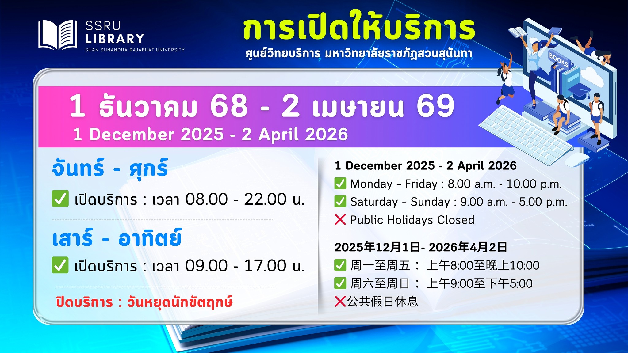 • Monday – Friday : 08.00 a.m. - 10.00 p.m.