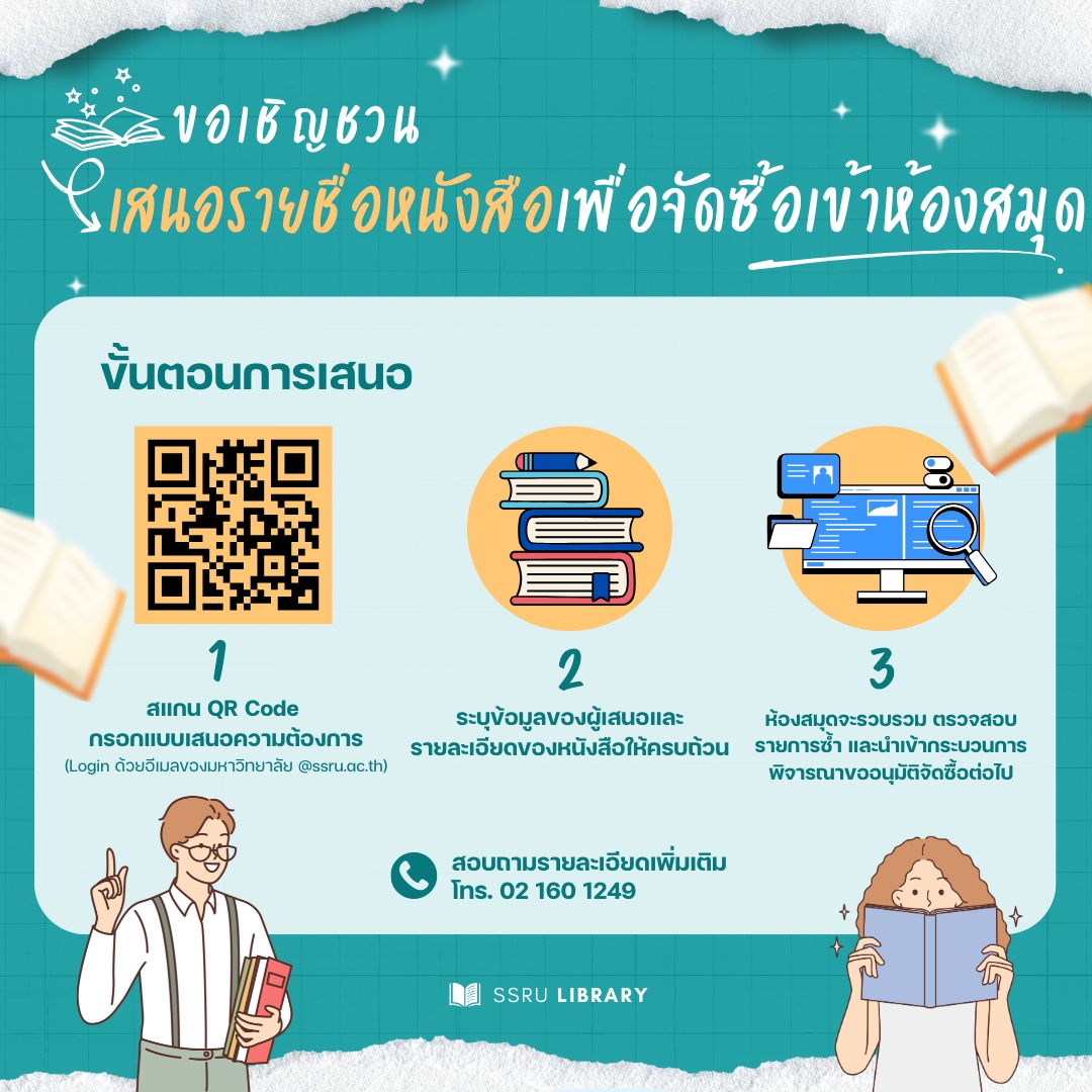 The Academic Resources Center, Office of Academic Resources and Information Technology invites students, faculty, researchers, and staff of Suan Sunandha Rajabhat University to suggest books for library purchase consideration, ensuring that the library collection aligns with your needs for learning, research, skill development, and personal inspiration, through the following process: