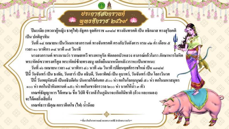 The Songkran Goddess of this year is named Nang Rakshasa Devi, who is adorned with an exquisite armband and a sacred Lotus flower tucked behind her ear. Her attire is embellished with the precious Agate gemstone, and her traditional sustenance is identified as blood. In her right hand, she wields a trident (Trishula), while her left hand holds a bow. She makes her grand appearance standing majestically upon the back of a boar, which serves as her celestial vehicle.