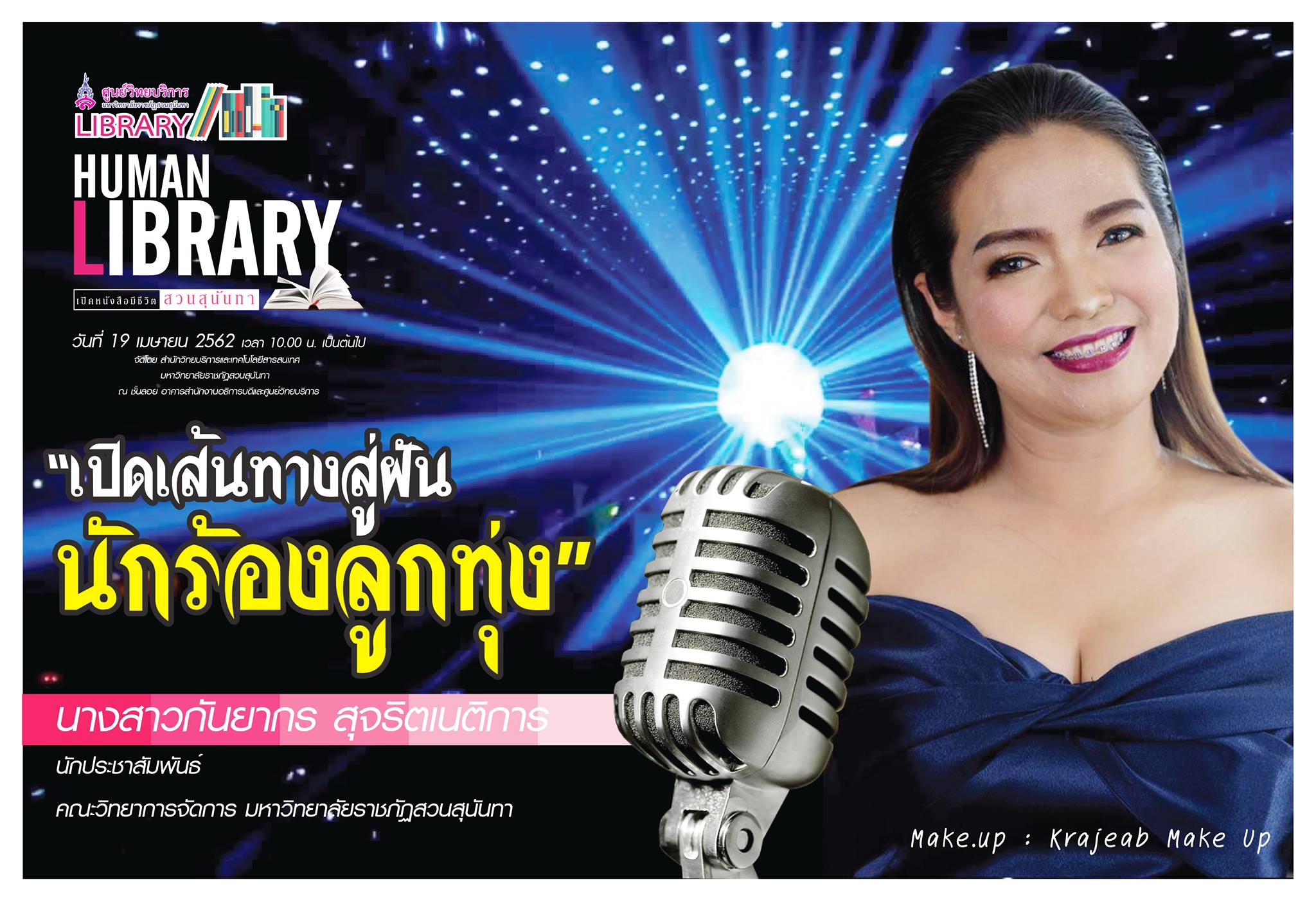 ขอเชิญร่วมโครงการเปิดโลกการอ่าน Human Library : หนังสือมีชีวิตสวนสุนันทา ครั้งที่ 3ตอนที่ 8 "เปิดเส้นทางสู่ฝันนักร้องลูกทุ่ง" พบกับสาวเสียงดีผู้รักการขับร้องเพลงลูกทุ่ง นางสาวกันยากร สุจริตเนติการ ที่จะมาถ่ายทอดเรื่องราวดี ๆ แนวคิด ประสบการณ์ชีวิต และชมการขับร้องเพลงลูกทุ่งเพราะ ๆ จากสาวผู้สานฝันเพื่อก้าวสู่การเป็นนักร้องลูกทุ่งในวันที่ 19 เมษายน 2562 เวลา 10.00 น. เป็นต้นไป ณ ชั้นลอย อาคารสำนักงานอธิการบดีและศูนย์วิทยบริการ จัดโดยสำนักวิทยบริการและเทคโนโลยีสารสนเทศ มหาวิทยาลัยราชภัฏสวนสุนันทา — กับ Rainny Linpee LukTung