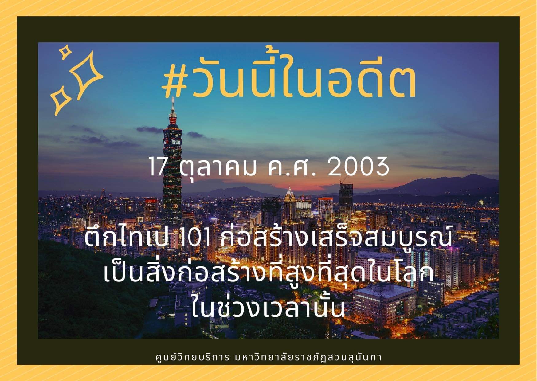 ไทเป 101 หรืออาคารศูนย์การเงินโลกไทเป กรุงไทเป สาธารณรัฐจีน (ไต้หวัน) เป็นตึกระฟ้าสูง 101 ชั้น หรือ 509.2 เมตร เป็นสิ่งก่อสร้างที่สุดในโลกอย่างเป็นทางการตั้งแต่ปี 2003 จนถึงการเปิดตัวของอาคารเบิร์จคาลิฟา ดูไบ ในปี 2010