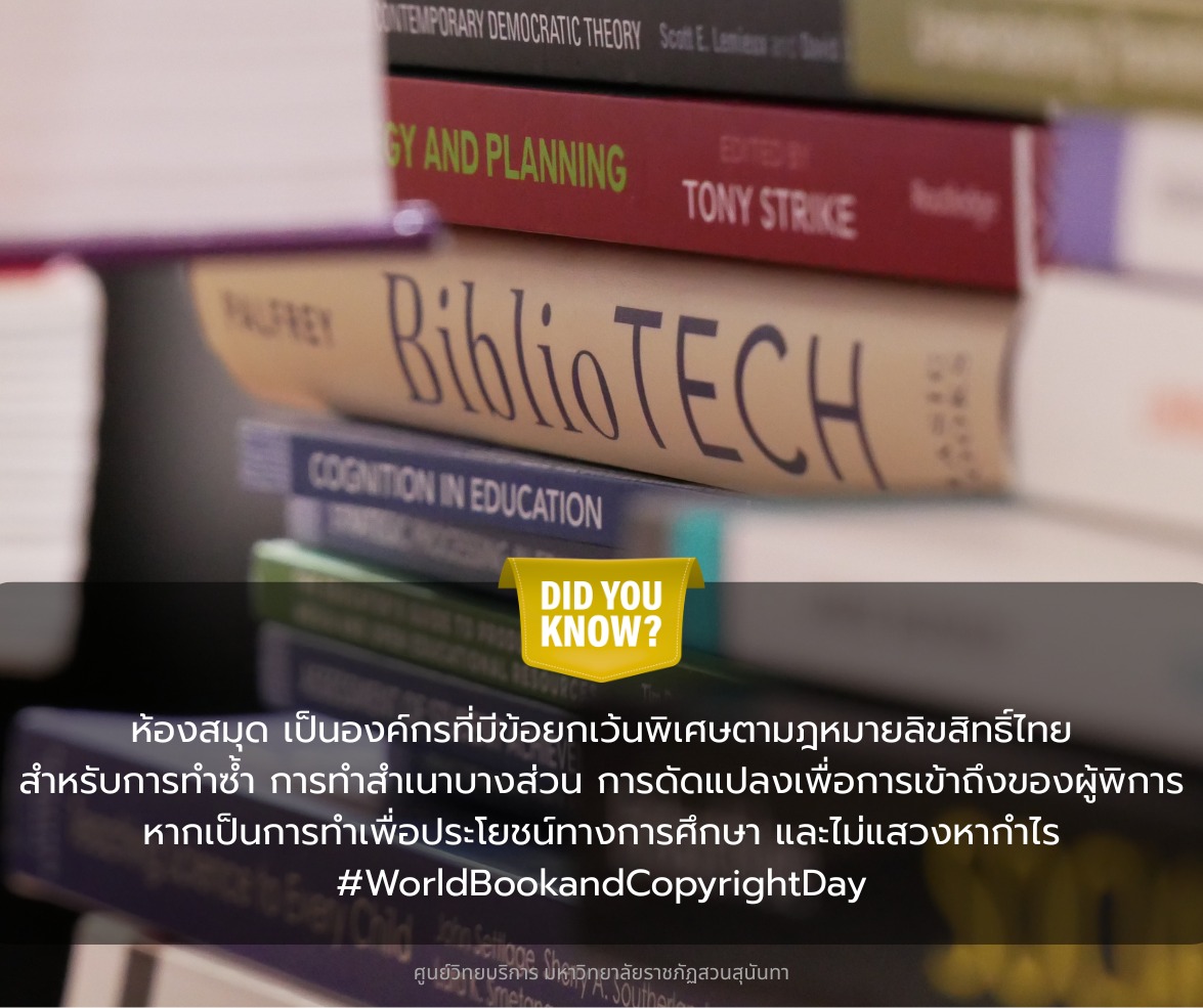 รู้หรือไม่? ห้องสมุดเป็นองค์กรที่มีข้อยกเว้นพิเศษตามฎหมายลิขสิทธิ์ไทย ที่ช่วยให้ห้องสมุดสามารถทำหน้าที่เป็นคลังปัญญาของสังคมได้อย่างเต็มที่ หากทำเพื่อประโยชน์ทางการศึกษาและไม่แสวงหาผลกำไร