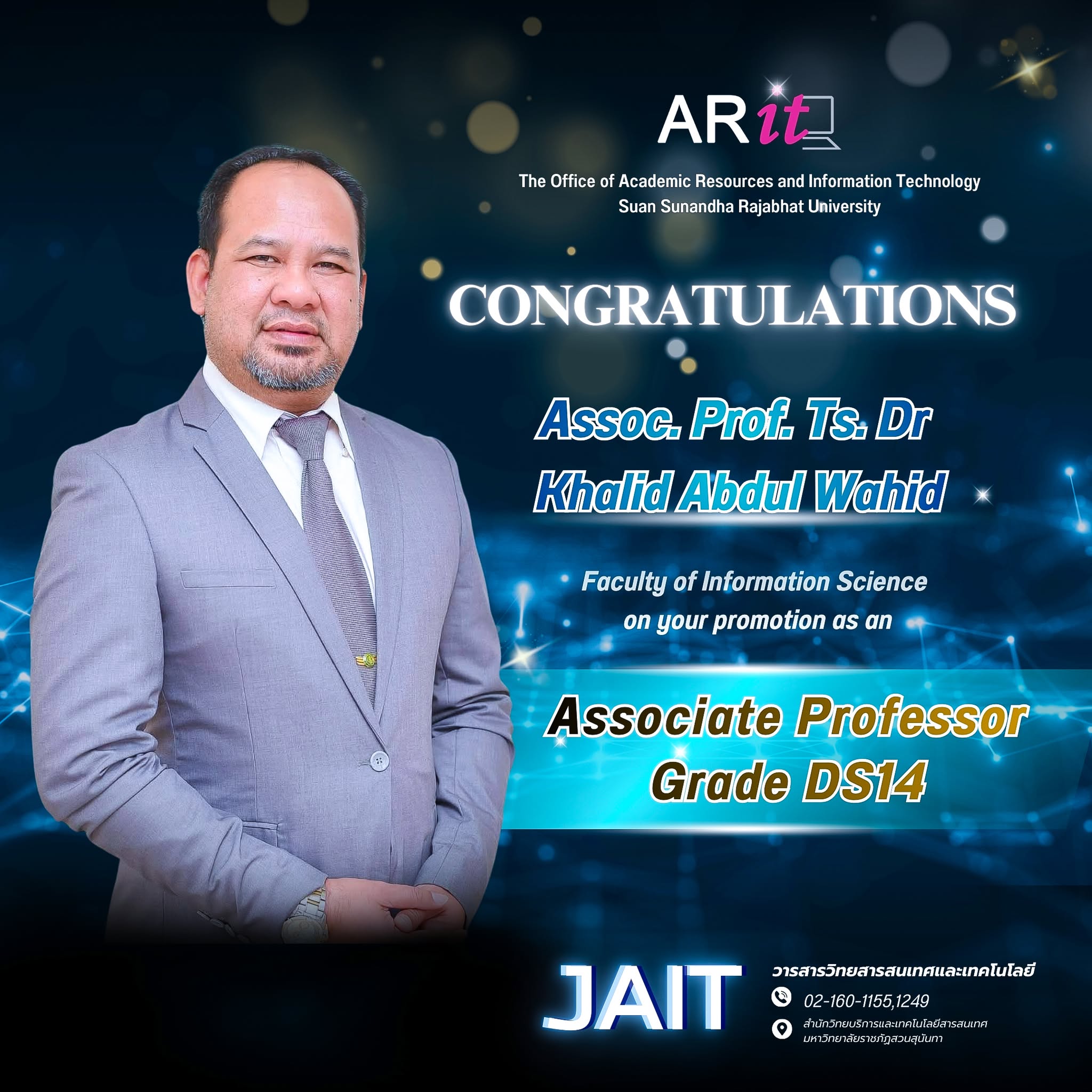 วารสารวิทยสารสนเทศและเทคโนโลยี ขอแสดงความยินดีกับ รองศาสตราจารย์ ดร. คาลิด อับดุล วาฮิด กองบรรณาธิการวารสาร ในโอกาสได้รับการเลื่อนตำแหน่งทางวิชาการเป็นรองศาสตราจารย์ ระดับ DS14 มีผลตั้งแต่วันที่ 15 พฤศจิกายน 2025