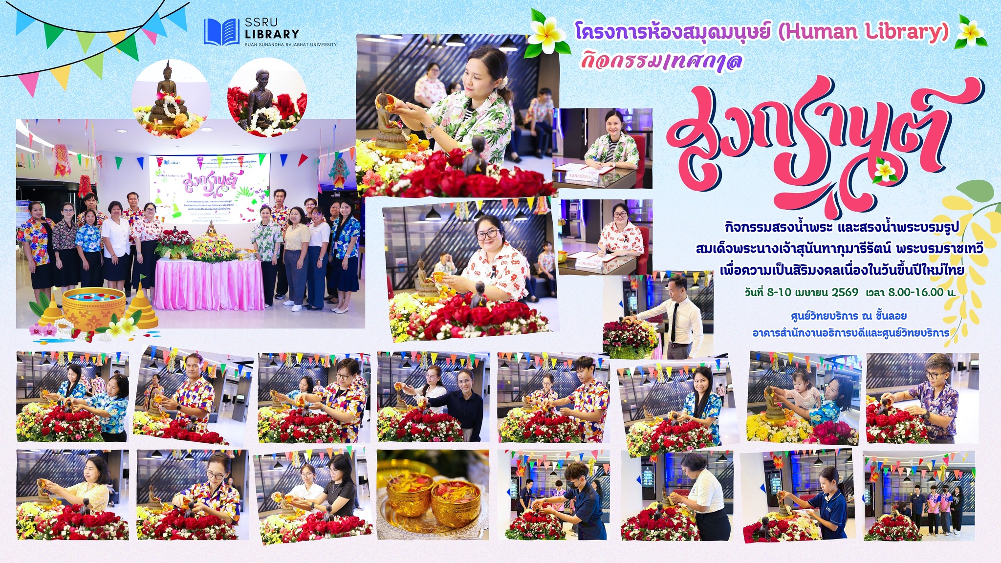 วันที่ 8-10 เมษายน 2569 ศูนย์วิทยบริการ สำนักวิทยบริการและเทคโนโลยีสารสนเทศ ได้จัดโครงการห้องสมุดมนุษย์ (Human Library) กิจกรรมเทศกาลสงกรานต์ นำโดย อาจารย์ ดร.พิมพ์พลอย ธีรสถิตย์ธรรม ผู้อำนวยการสำนักวิทยบริการและเทคโนโลยีสารสนเทศ อาจารย์เบญญา หวังมหาพร รองผู้อำนวยการศูนย์วิทยบริการ พร้อมด้วย นักเรียน นักศึกษา คณาจารย์ และบุคลากรของมหาวิทยาลัยราชภัฏสวนสุนันทา ร่วมกิจกรรมสรงน้ำพระ และสรงน้ำพระบรมรูปสมเด็จพระนางเจ้าสุนันทากุมารีรัตน์ พระบรมราชเทวี เพื่อความเป็นสิริมงคลเนื่องในวันขึ้นปีใหม่ไทย ณ ศูนย์วิทยบริการ ชั้นลอย อาคารสำนักงานอธิการบดีและศูนย์วิทยบริการ