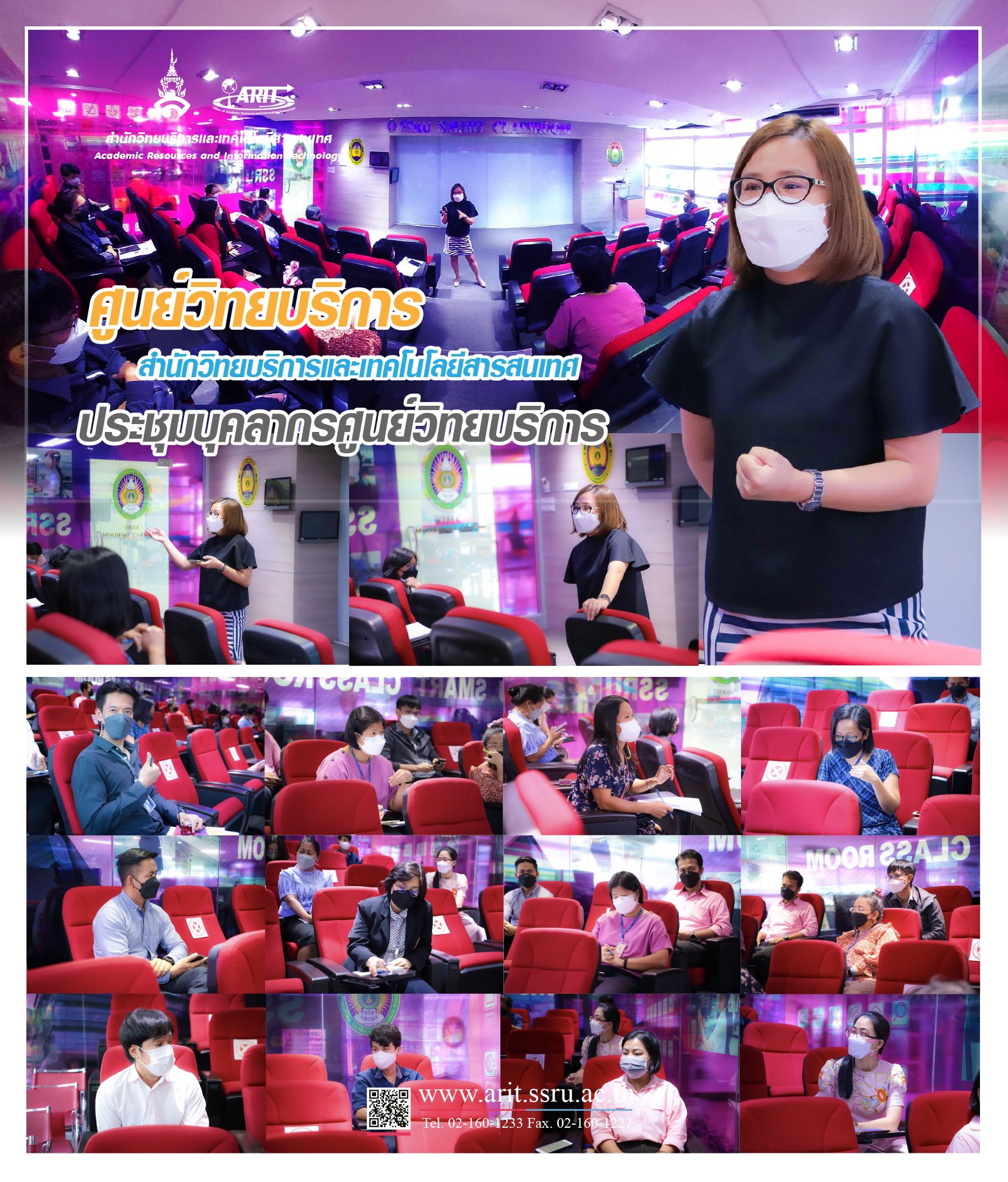 วันที่ 17 พฤษภาคม 2565 ศูนย์วิทยบริการ สำนักวิทยบริการและเทศโนโลยีสารสนเทศ ประชุมบุคลากรศูนย์วิทยบริการ เพื่อวางแผนและติดตามการดำเนินงานของศูนย์วิทยบริการ นำโดย อาจารย์ ดร.พิมพ์พลอย ธีรสถิตย์ธรรม รองผู้อำนวยการศูนย์วิทยบริการ ณ ห้อง SSRU Smart Classroom ชั้น 2 ศูนย์วิทยบริการ