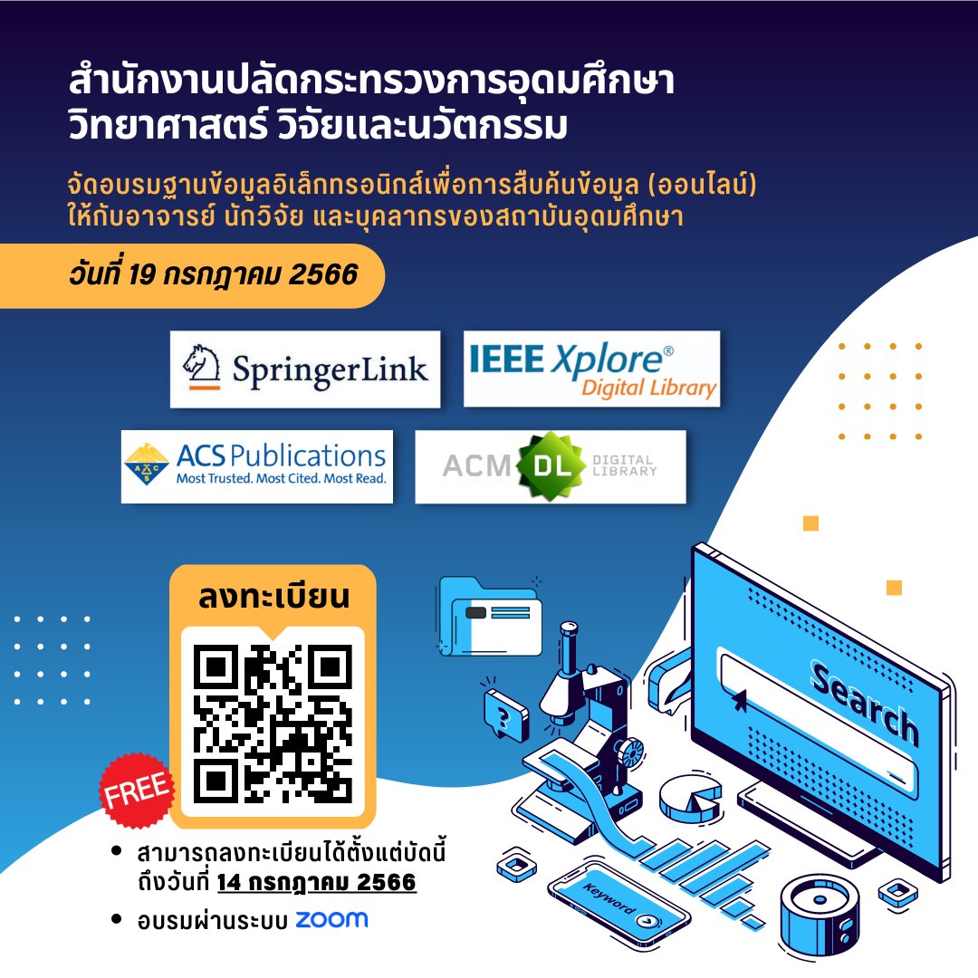 สำนักงานปลัดกระทรวงการอุดมศึกษา วิทยาศาสตร์ วิจัยและนวัตกรรม จัดอบรมฐานข้อมูลอิเล็กทรอนิกส์เพื่อการสืบค้นข้อมูล (ออนไลน์) ให้กับอาจารย์ นักวิจัย และบุคลากรของสถาบันอุดมศึกษา จำนวน 4 ฐาน ได้แก่